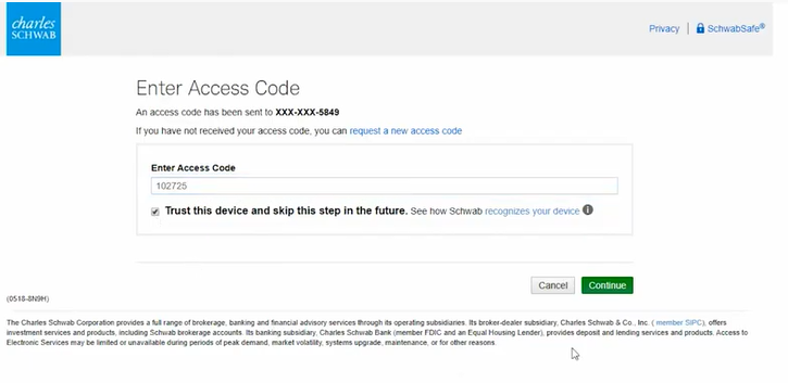 As an additional layer of security, Schwab will text you an access code to your mobile phone or call you directly. Once received type in the access code provided by Schwab.