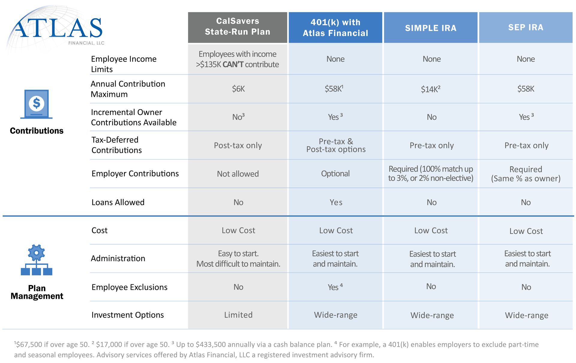 When it comes to saving money on taxes, there is no competition between an Atlas 401(k) plan and the CalSavers plan. This is because the CalSavers plan only allows for Roth (post-tax) contributions, whereas a 401(k) plan allows for pre-tax and Roth contribution options. This means there is no tax deduction on contributions to a CalSavers plan. On the other hand, contributions to a 401(k) plan can be either pre-tax or post-tax, which means the participant gets to decide.