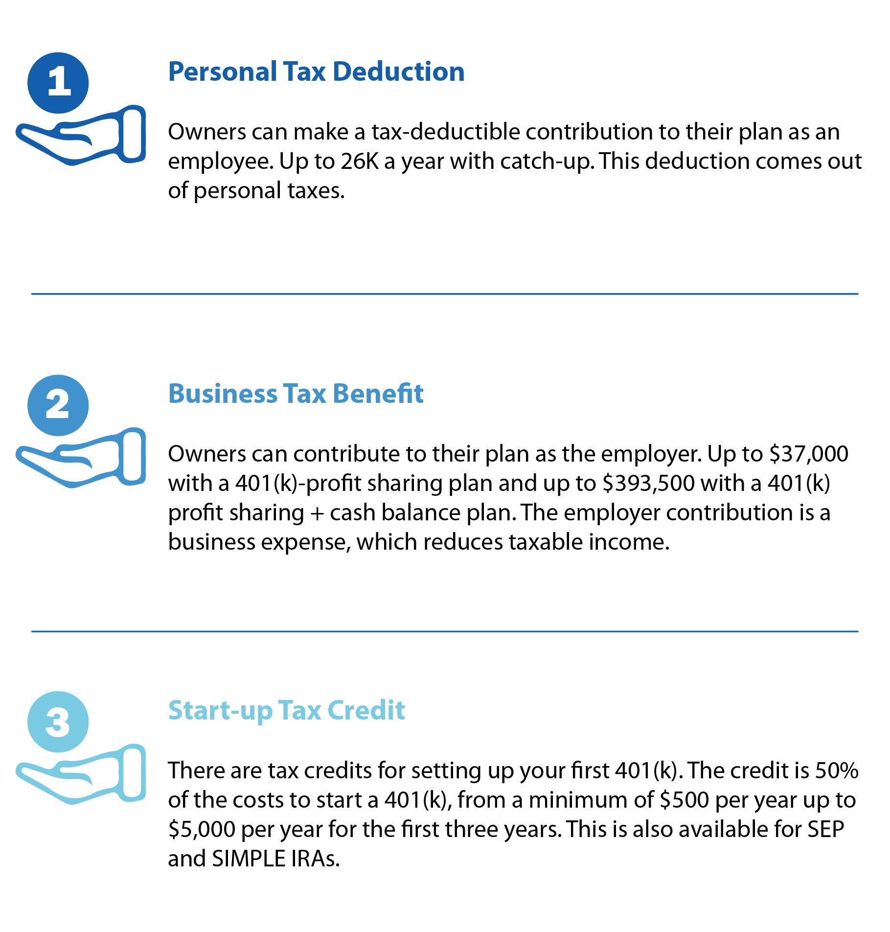 A 401(k) provides business owners three ways to save on taxes: