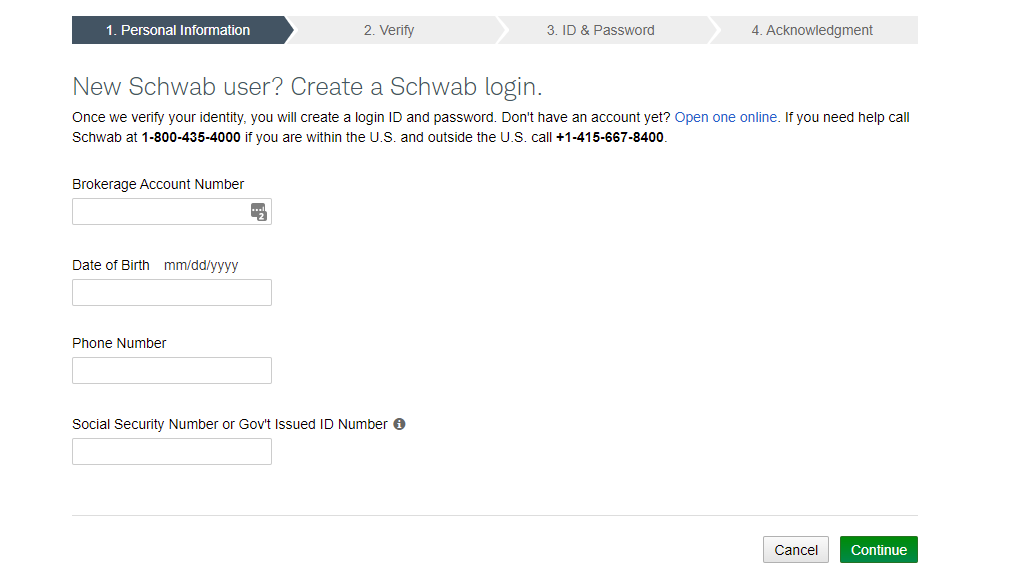 This will bring you to Schwab’s website to activate your online access. Under the login button, click New User to get started.