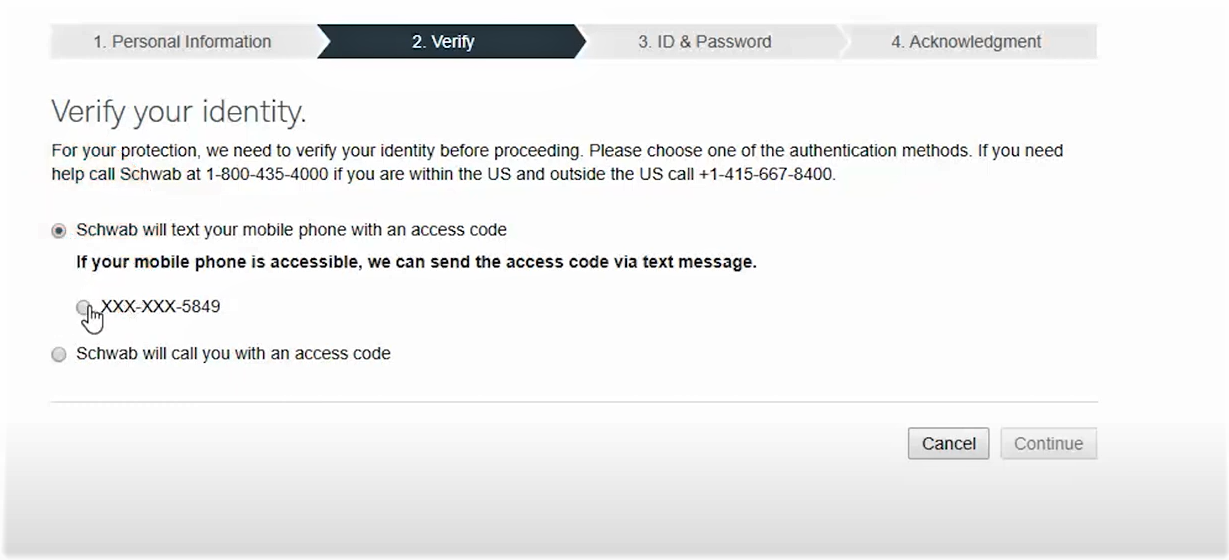 As an additional layer of security, Schwab will text you an access code to your mobile phone or call you directly. Once received type in the access code provided by Schwab.